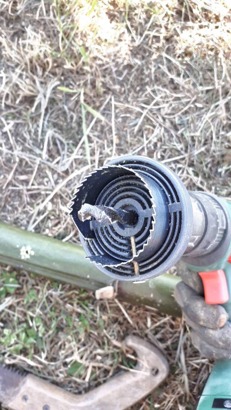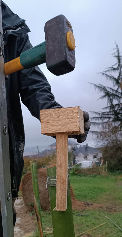 Pour ne pas flinguer le pilier en tapant dessus à la masse pour l'enfoncer dans le sol, on a fabriqué des "cabochons sacrificiels" qu'on insère en haut de la tige (et je vous conseille en plus de cercler le haut de la tige avec du fil de fer).