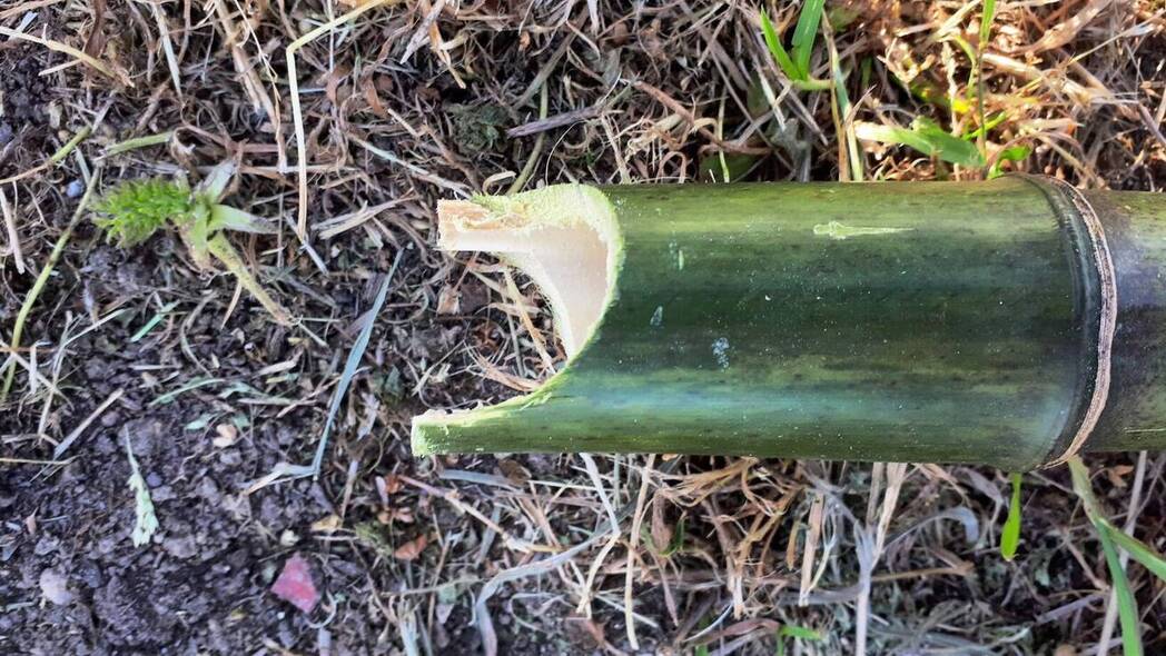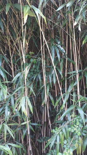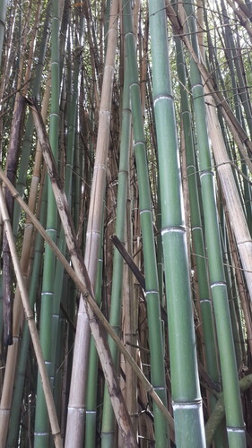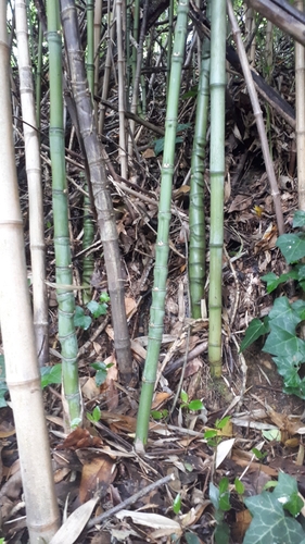 Le bambou doré est plus fin et un peu moins haut que le Madaké. Il se reconnaît bien à ses entre-noeuds renflés à la base de la tige.