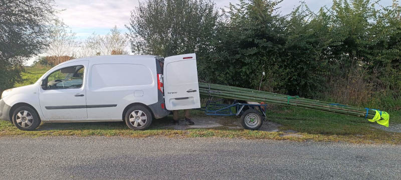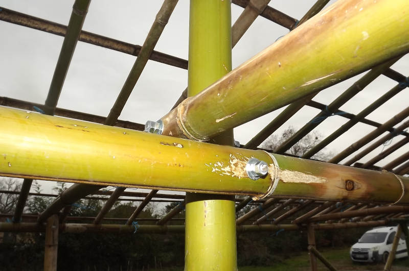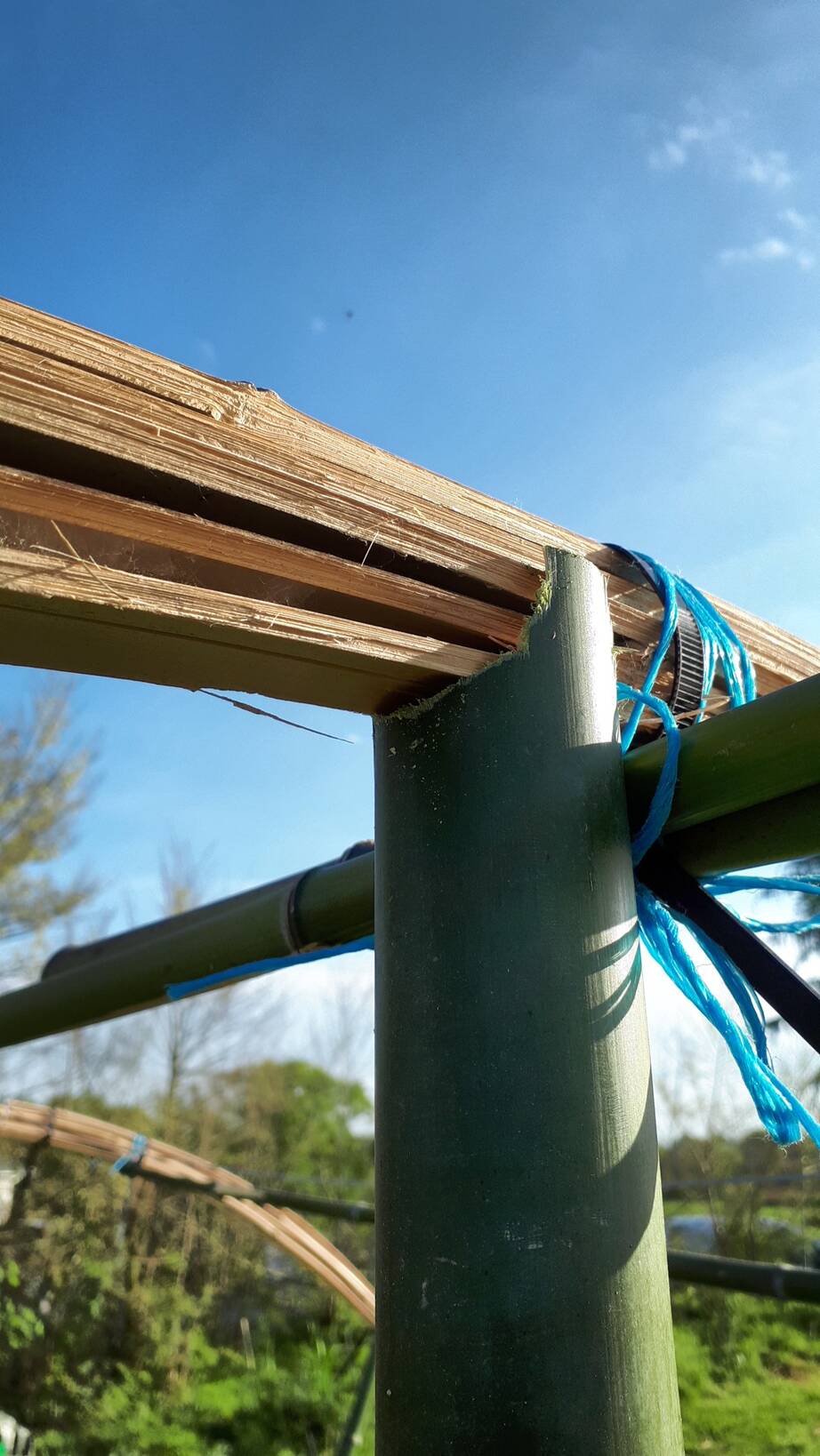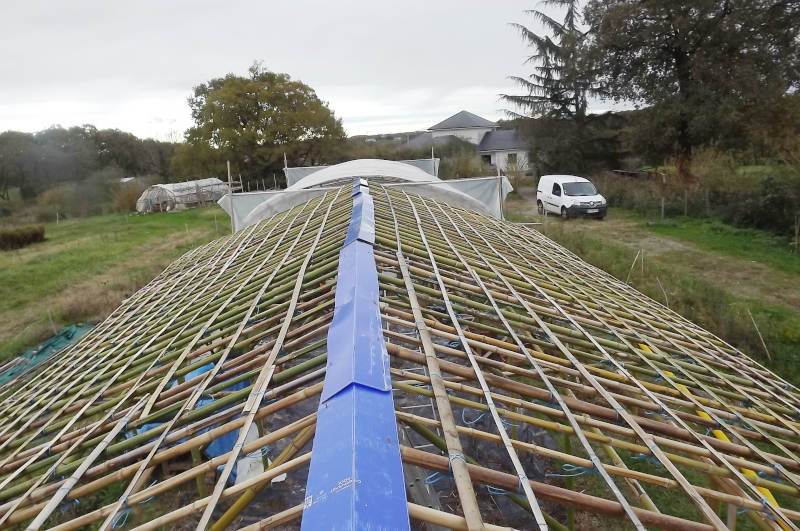 Pose de lamelles de bambous pour compléter les entretoises et éviter la formation de poches d'eau.