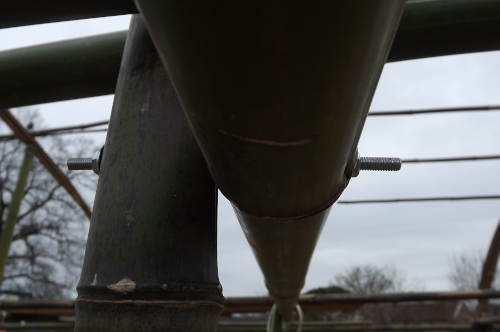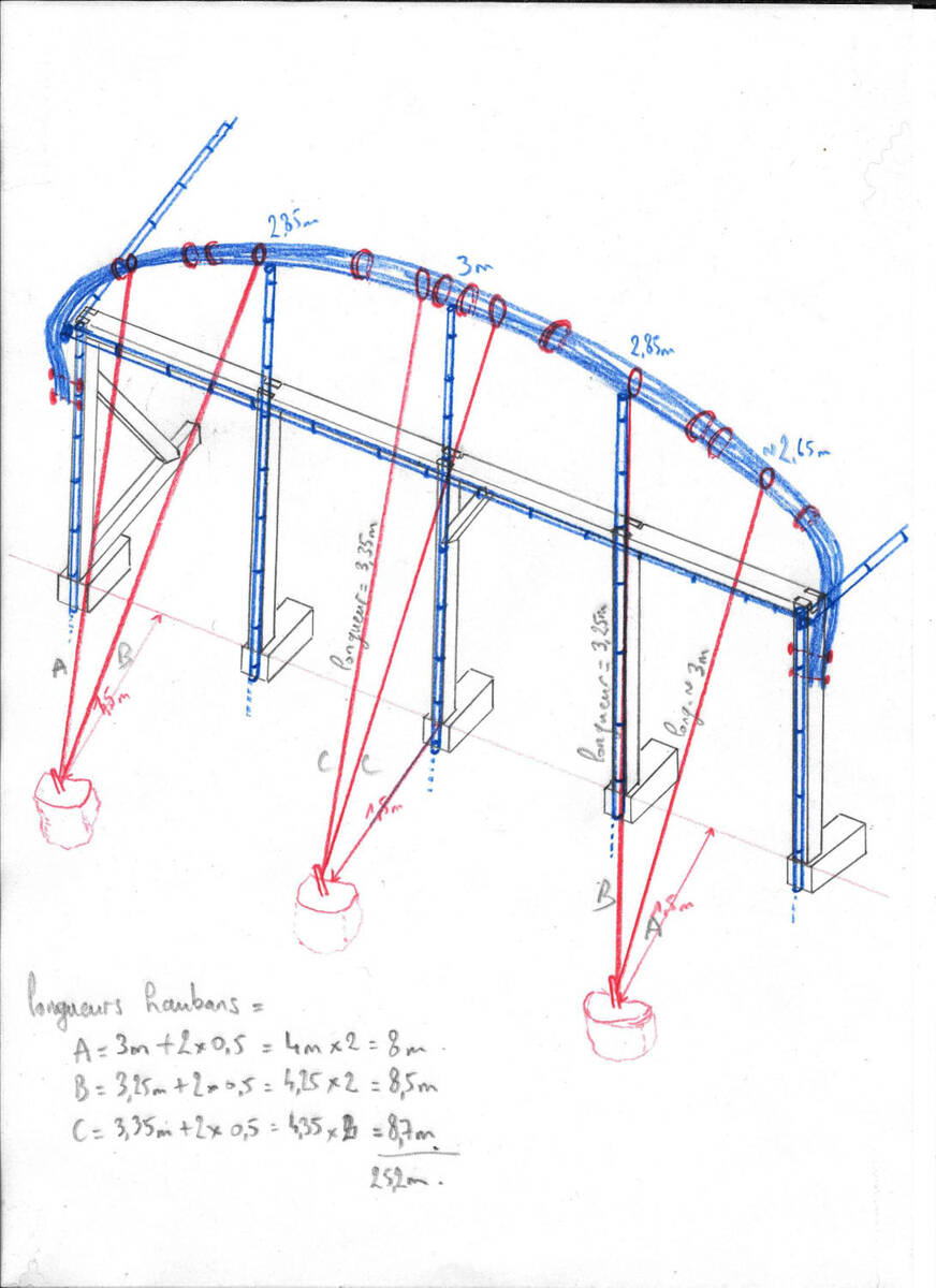 L'arceau est simplement posé sur les piliers. J'ai eu la flemme de faire des "bouches de poisson" cette fois-ci, mais j'ai sans doute eu tord : c'est quand même pas mal pour tenir l'arceau en place. Ici ce que j'ai fait c'est que l'arceau est fixé au pilier avec du fil de fer.