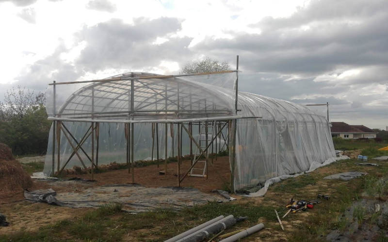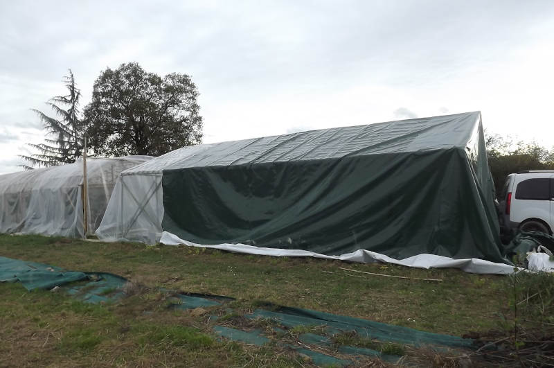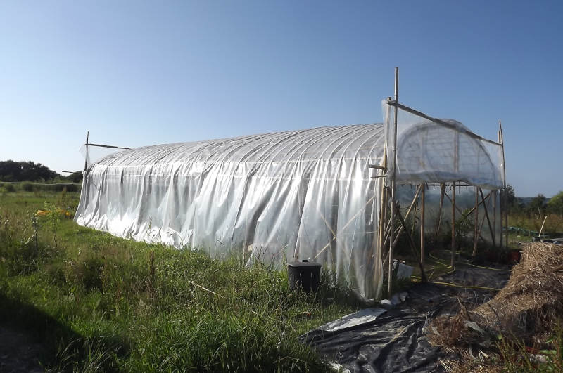 Mi mai la serre est enfin bâchée ! Noter les sacs de lest remplis de terre : cela permettra de débâcher facilement afin de réaliser les travaux d'entretien et de réparation