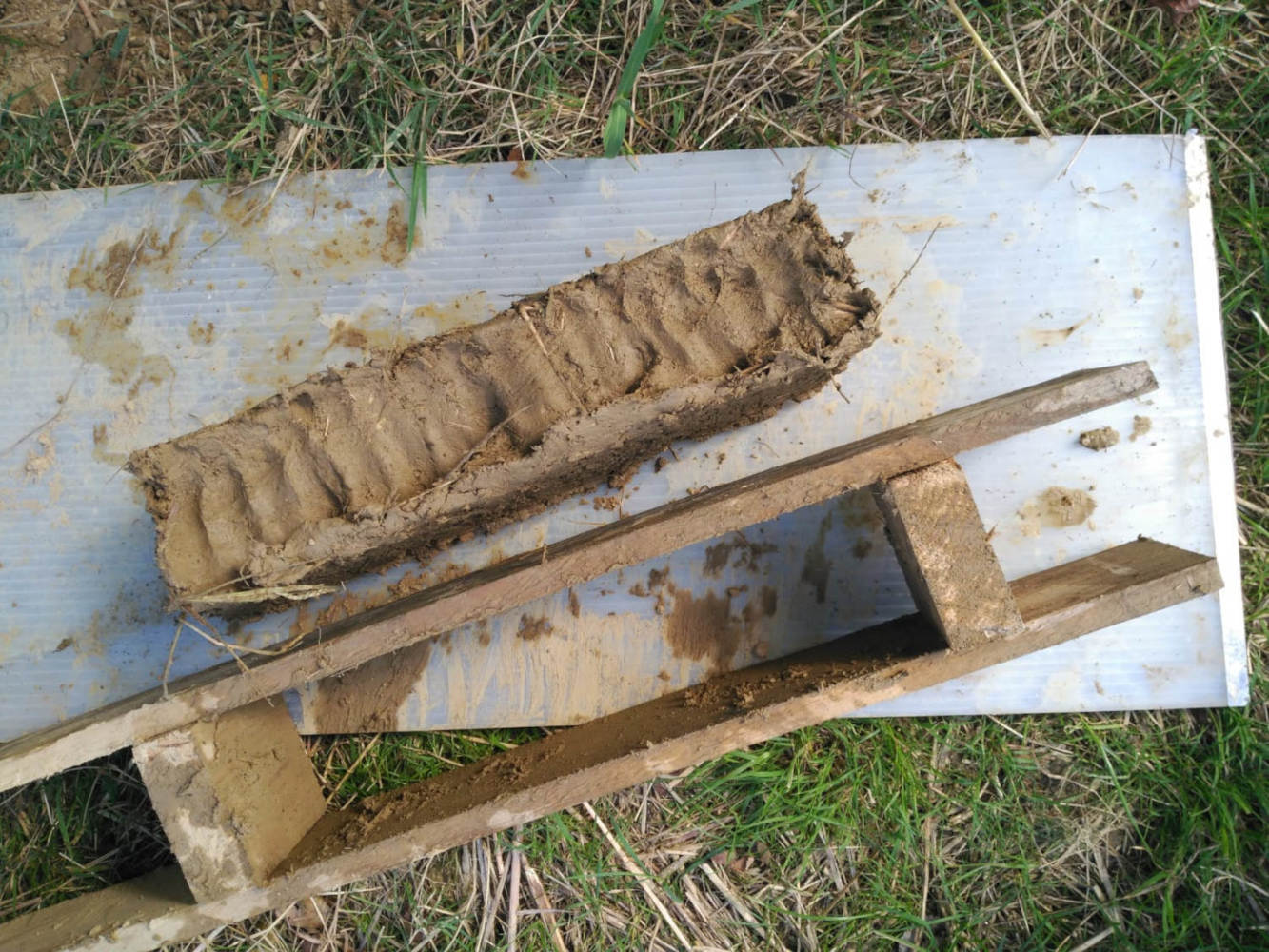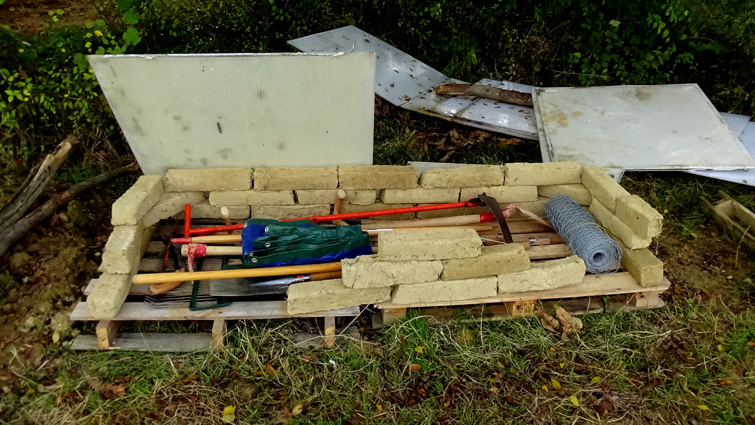 On continue de débroussailler un chemin dans le roncier, ici on remonte vers l'est, après avoir passé le ruisseau.Novembre : premier abri pour les outil monté sur palettes, élévation en adobes de terre crue et paille, couverture en plaques polycarbonates.OctobreTest de briques ("adobe") en terre crue et paille : sechageTest de briques ("adobe") en terre crue et paille : moulageCouché de soleil sur les herbesTest de terre crue et de poël "dragon"CampingSoirée avec des amis"La source" (en tout cas le croyait on à l'époque), on découvrira plus tard que celle-ci est en fait plus haut. On est en août et ça coule.On descend dans le roncier vers "la source".Premiers essais à la faux : c'est compliqué mais très plaisant !JuilletJuin : la prairie d'Ivraie (Ray Grass) a complètement séchée.